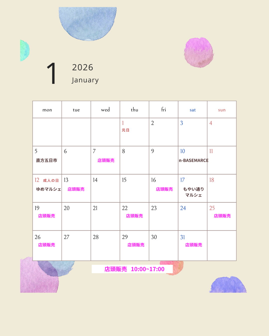 店頭販売日やマルシェ出店日につきましては、掲載のカレンダーをご確認ください。